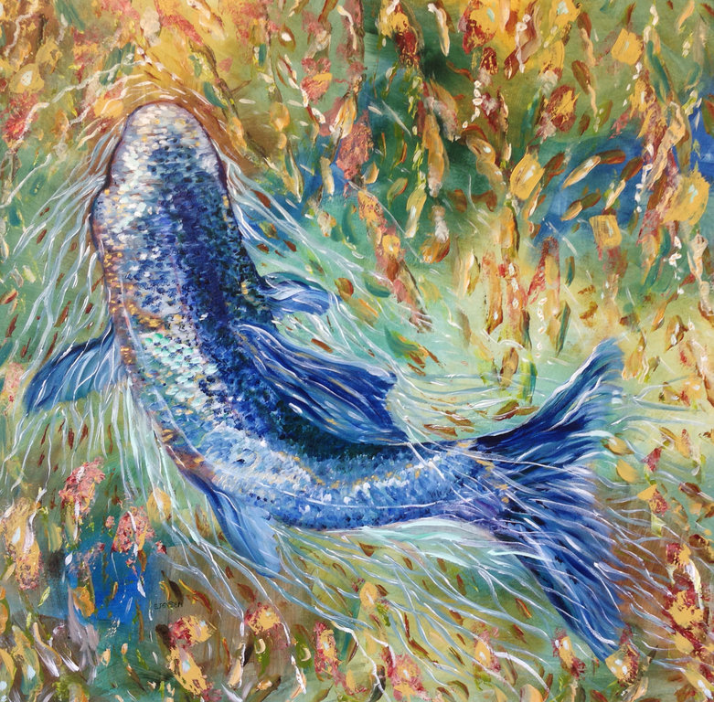 A balance between color and composition are foremost in my mind as I paint. My interest in unlikely colors next to each other establish the mood and power of the work. Deconstructing water in many colors creates a lively feeling of motion and contrasting brush strokes leaning against palette knife edges, organic objects, fingerprints emphasize the texture of the work. Lately I have been focusing on design elements in nature.