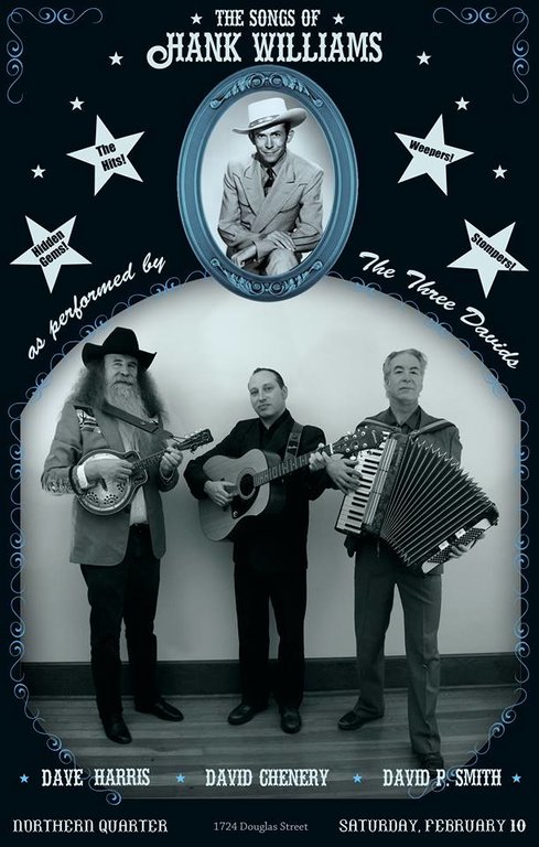 The Songs of Hank Williams: Three Davids Do Hank brings David Chenery, Dave Harris, and David P. Smith together in a shifting line-up – trios, duos, and solo – that broadly covers the Hank Williams songbook. You’ll hear the defining hits, obscure hidden gems, weepers, and stompers. This is not a museum piece. The Three Davids are not recreating the sound of Hank Williams and the Drifting Cowboys, they are interpreting the music with love, vitality, respect, energy, and emotion.