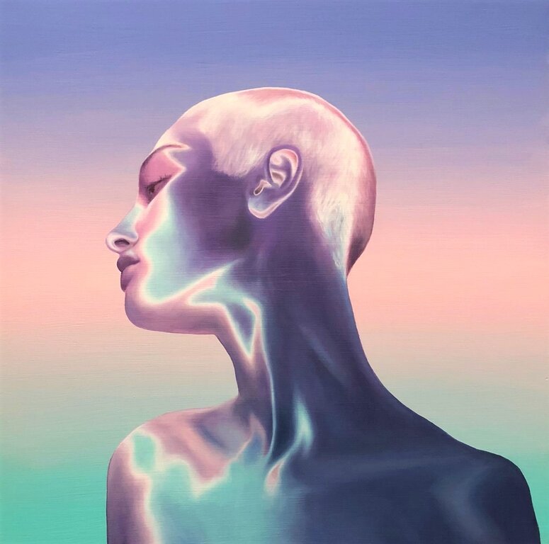 Mostly self-taught, she uses oil paint to evoke the otherworldly. She is known for her dreamlike, symbolic, and ethereal compositions and for her use of iridescent colour palettes. More recently, she has been exploring the tension between Nature and digital, between the archetypal and the technological, and wondering what the raw, primordial power of the Feminine means in the metaverse.