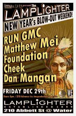. Friday December 29th IMU & CiTR present LAMPLIGHTER NEW YEAR'S BLOW-OUT WEEKEND w/ Run GMC, Matthew Mei, Foundation, Cheek & Dan Mangan @ The LAMPLIGHTER, 210 Abbott Street . Doors 8pm / Advance Tickets $10 via the bands or online @ http://www.imuproductions.com/tix