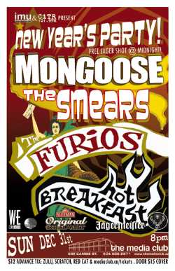 . Sunday, Dec 31st IMU & CiTR present NEW YEARS PARTY! w/ Mongoose, The Smears, The Furios + Hot Breakfast @ The MEDIA CLUB . 8pm / $12 Advance tickets available at Zulu, Scratch & Red Cat . Cover is $15 at the door . FREE SHOT of JAGER at MIDNIGHT for all New Year's patrons!