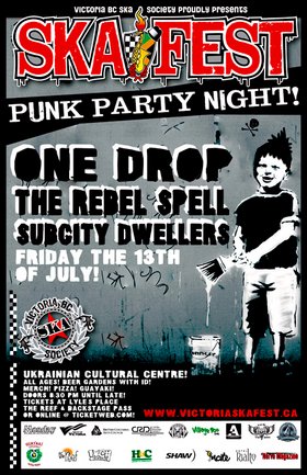 sO... Punk party night at Victoria's Annual Ska Festival continues;) This time we'll call it a Friday the 13th Special! This year we are proud to host ONE DROP once again with special guests The Rebel Spell & for their second year straight ---> SubCity Dwellers! All Ages w/ Beer Garden on site with ID. Merchandise Tents Pizza also on site courtesy of the Joint & Guayaki Energy Drink will also be sold.