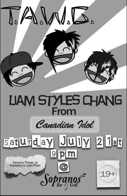 Fresh from the Canadian Idol stage, direct to the Soprano's stage - Liam Styles Chang and his band T.A.W.G. (Two Asians and a White Guy). Come early for best seats! Tickets are available NOW at Lyle's Place and Soprano's.