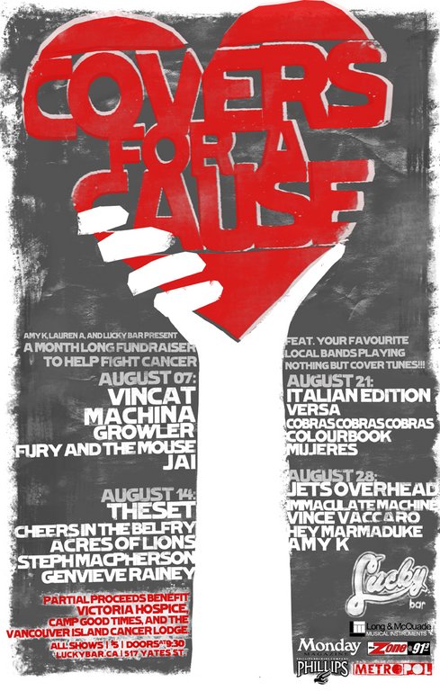 COVERS FOR A CAUSE - a month-long benefit to help fight cancer! Over four weeks, twenty of your favourite local bands play nothing but cover tunes cover tunes to raise money for the Victoria Hospice, Camp Good Times, and the Vancouver Island Cancer Lodge!