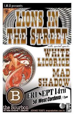 . Friday, September 14th I.M.U. presents LIONS IN THE STREET w/ WHITE LICORICE & MAD SHADOW @ The Bourbon, 50 West Cordova . Doors 7pm / $10 - Purchase advance tickets online at http://www.imuproductions.com/tix