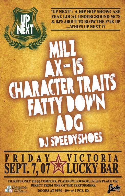 Up Next - a Showcase of new Homegrown Hip Hop talent, featuring:: Milz, Ax-Is, Character Traits, Fatty Down, Adg, DJ SPEEDY SHOES, DJ Degree One @ Lucky Bar Sep 7 2007 - Dec 26th @ Lucky Bar