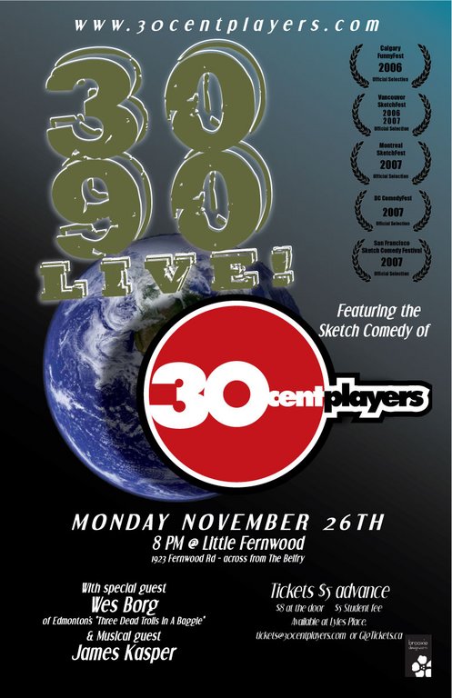 The 30 Cent Players return to Fernwood for an all-new show! 90 minutes of laughs and music as part of the all-new bi-monthly show dubbed "30 90 LIVE!" This edition features musical guest James Kasper and will be hosted by Edmonton's own Wes Borg (Three Dead Trolls In A Baggie)!
