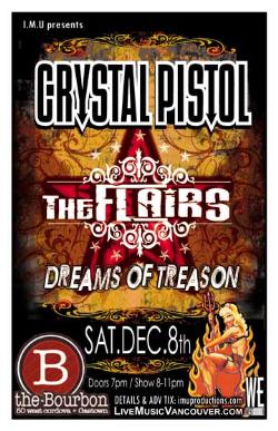 . Saturday, December 8th I.M.U. presents CRYSTAL PISTOL, The FLAIRS & DREAMS OF TREASON @ The Bourbon, 50 West Cordova . Doors 7pm / $10 Advance tickets @ ZULU, SCRATCH, NOIZE, BONE RATTLE, directly via the bands and online @ http://www.imuproductions.com/tix