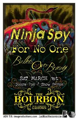 Saturday, March 1st I.M.U. presents NINJA SPY w/ FOR NO ONE & BULLETS OVER BEAUTY @ The Bourbon, 50 West Cordova . Doors 7pm . Show 8-11pm sharp / $10 Advance