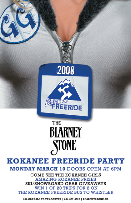 WOW! The Kokanee Free Ride Party is going down at The Blarney Stone on Monday March 10th. We've got some amazing prizes to give away as well. 20 trips for two to Whistler aboard the Kokanee bus, free snowboard, ski/snowboard jacket, Kokanee beer fridge, and much more. Oh Yeah, The Kokanee Girls will be here as well! You don't want to miss this one. Reserve your party now in the reservations section.
