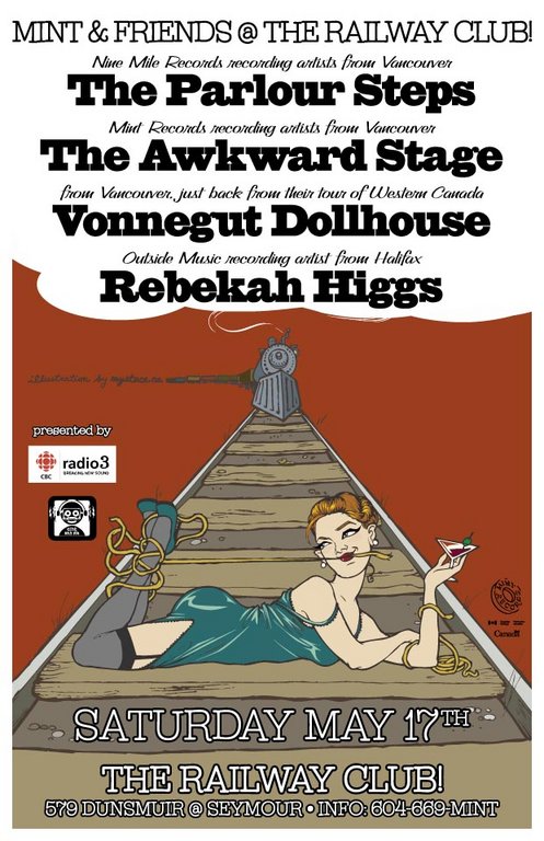 Nite 3 of Mint Records' 3 Nites @ the Railway Club. Nine Mile recording artists from Vancouver, The Parlour Steps. Mint Records recording artists from Vancouver, The Awkward Stage. Fresh from their Western Canadian tour, Vonnegut Dollhouse. And from Eastern Canada, Outside Music recording artist, Rebekah Higgs. Presented by CiTR FM and CBC Radio 3.