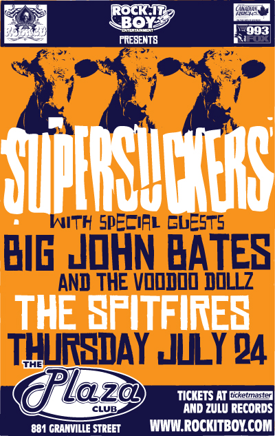 ROCKED THURSDAYS at the Plaza Club is not for the faint of heart! 99.3 The FOX and Rock.It Boy Entertainment present SUPERSUCKERS in concert with special guests BIG JOHN BATES & THE VOODOO DOLLZ plus THE SPITFIRES on Thursday, July 24th at the Plaza Club, 881 Granville St in Vancouver (phone Ph 604-646-0064).. Advance tickets are available for $20 at all Ticketmaster outlets (online at www.ticketmaster.ca or Charge-by-Phone at 604-280-4444) and Zulu Records or $25 at the door. Doors open at 9:00PM.