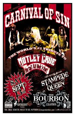 . Saturday, Sept 13th I.M.U. presents CARNIVAL OF SIN ~ The World's #1 Tribute to Motley Crue w/ special guests STAMPEDE QUEEN @ The Bourbon, 50 West Cordova . Early show 8-11pm sharp - Purchase advance tickets online @ imuproductions.com