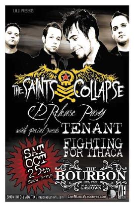 . Saturday, Oct 25th I.M.U. presents The SAINTS COLLAPSE CD Release Party w/ TENANT & FIGHTING FOR ITHACA . Early Show 8-11pm @ The Bourbon, 50 West Cordova / Purchase advance tickets online @ imuproductions.com