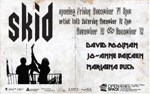Open Space presents SKID, an exhibition that locates the playful festishization of signfiers that bear witness to group identification within Heavy Metal culture and its subgenre's Speed Metal, Death Metal, and Thrash. The work ofJo-Anne Balcaen (Montreal), Marlaina Buch (Victoria) and David Poolman (Toronto) riff off Heavy Metal’s fascination with death as a sign as it runs paralell to the subculture’s emphatic celebration of such life-affirming rituals as attending concerts collecting records, growing hair and submitting to various forms of body beautication art.
