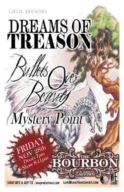 . Friday, Nov 28th I.M.U. presents DREAMS OF TREASON, BULLETS OVER BEAUTY & MYSTERY POINT @ The Bourbon, 50 West Cordova . Early show 8-11pm sharp / Purchase advance tickets online @ www.imuproductions.com