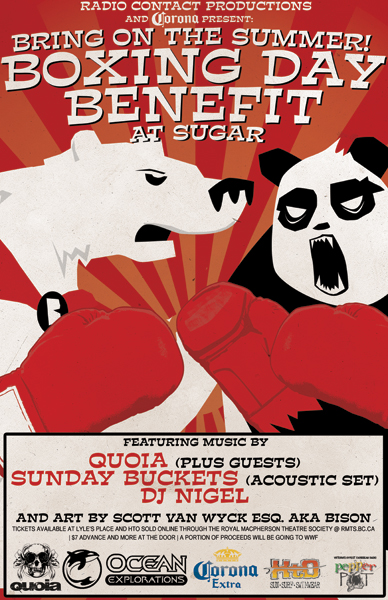 Radio Contact Productions and Corona present Bring on the Summer! Boxing Day Benefit at Sugar Nightclub. This summer-themed party features live bands, a DJ, an art showcase, and a fantastic way to deal with your family anxieties this holiday season! Quoia (local musicians Alex Nichols, Mike Hann, Jeff Scotney, Mike Roma, Keith Gallant, and guests) and Sunday Buckets will be performing live and local favourite DJ Nigel will keep the party going, island-style. Local artist Scott Van Wyck aka Bison's work will be showcased throughout the club and will be available for purchase. Additionally, partial proceeds will be donated on behalf of the endangered Canadian polar bear to the World Wildlife Fund. Bikini tops are encouraged and there definitely won't be a kids table.