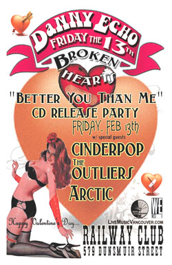 . Friday, Feb 13th IMU presents DANNY ECHO's Friday the 13th Broken Hearts,"Better You Than Me" CD Release Party w/ special guests CINDERPOP, ARCTIC & The OUTLIERS @ The Railway Club, 579 Dunsmuir