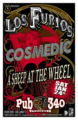 . Saturday, Jan 24th IMU presents LOS FURIOS, COSMEDIC & A SHEEP AT THE WHEEL @ PUB 340, 340 Cambie Street . Doors 8pm / Purchase advance tickets online @ www.imuproductions.com