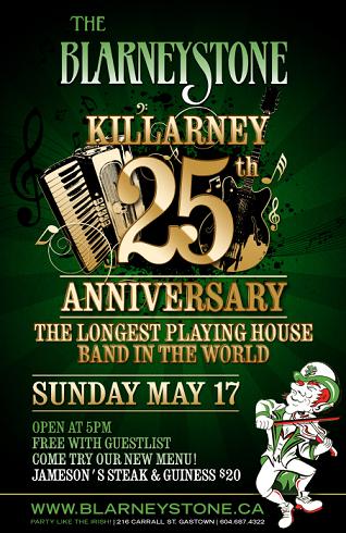 Come party with us on May 17th and help Killarney celebrate their 25th anniversary on Sunday May 17th!!! They are theh longest playing house band in the world and the Hardest Working Band in Gastown!!! We are helping them celebrate by offering FREE COVER if you make a guestlist. Doors open for dinner at 5pm. You don't want to miss this one!!!!