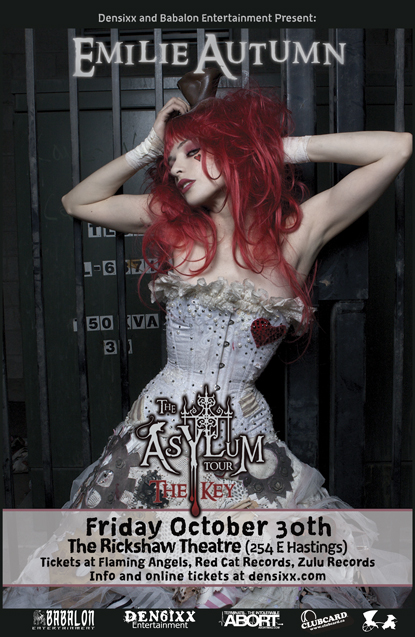 UK Goth Queen Emilie Autumn will be providing Vancouver's Devil's Night Entertainment with her dark and shocking Asylum Tour, be prepared for fire, aerials, music, and much more!
