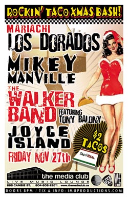 . Friday, November 27th IMU presents the ROCKIN' TACO XMAS BASH! MIKEY MANVILLE, WALKER BAND w/ TONY BALONY, LOS DORADOS & JOYCE ISLAND @ The Media Club, 695 Cambie Street . Doors 8pm / Purchase advance tickets online @ www.imuproductions.com
