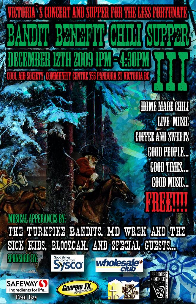 This is our Third year hosting the Bandit Benefit Chili Supper. It is a FREE show being held for Victoria's less fortunate and homeless community. Home cooked Chili, rockin tunes, good people, sweets, coffee... all are welcome, this is a family event so feel free to bring your kids down.