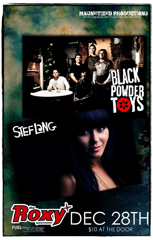 Description:Cost:$5 Description:Magnetized Productions & The Roxy proudly presents Black Powder Toys www.myspace.com/blackpowdertoys with Guest Stef Lang www.myspace.com/steflang on Monday, December 28, 2009 at The Roxy at 932 Granville Street in Vancouver. Doors open at 7:00 p.m. The first band starts at 8 p.m.
