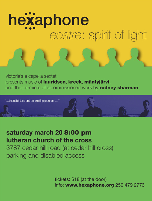 Hexaphone, Victoria’s six-member a capella vocal ensemble, presents music by Rodney Sharman, Mäntyjärvi, Kreek, Lauridsen, and lighter arrangements of tunes by the Beatles and Billy Joel.