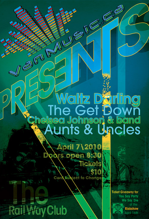 Van Music www.vanmusic.ca presents a night of local talent every month at the Railway Club 579 Dunsmuir Street. This Wednesday April 7th we will showcase a stellar line up of Vancouver bands. Up coming talents Aunts and Uncles and Chelsea Johnson with her new band Sunday’s Best will open the night followed by an energetic east European rock flavor of Waltz Darling. Headlining will be The Get Down, a superb chameleonic band who just released their second CD Are you down! Doors at 8:30 PM tickets $10.