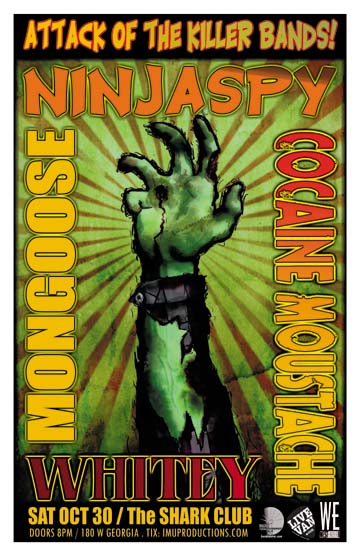 . Saturday, October 30th IMU presents ATTACK OF THE KILLER BANDS! NINJASPY, WHITEY, COCAINE MOUSTACHE & MONGOOSE @ The Shark Club, 180 West Georgia Street . Doors 8pm / $12 advance online @ http://www.imuproductions.com/tix . $15 cover @ the door