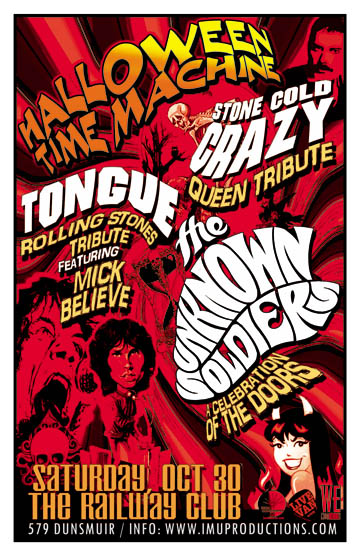 . TONIGHT! Saturday, October 30th IMU presents HALLOWEEN TIME MACHINE! featuring STONE COLD CRAZY Queen Tribute, TONGUE Rolling Stones Tribute & The UNKNOWN SOLDIERS: A Celebration Of The Doors @ The Railway Club, 579 Dunsmuir . Doors 9pm / Cover $10