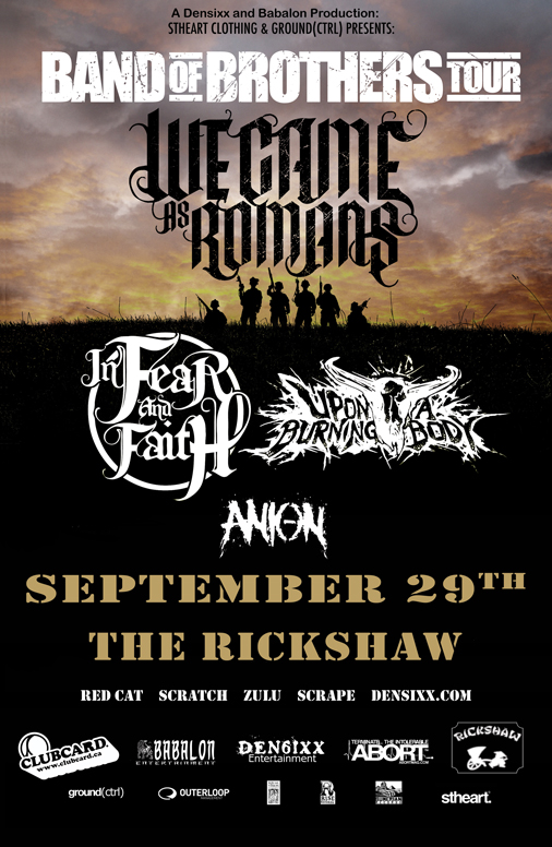 Babalon and Densixx Entertainment are proud to present Equal Vision recording artists We Came As Romans at Vancouver's infamous Rickshaw Theatre on Wednesday September 29th. The Detroit sextet have embarked on a North American tour (Band of Brothers Tour) with Sand Diego's post hard-core up and comers In Fear and Faith (Rise Records) and Texas metal-core upstarts Upon a Burning Body (Sumerian Records).