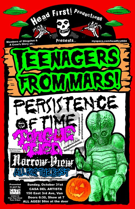 Persistence of Time (rockin' HARD core classics!),Tongue Tied (North Van punks!), Narrow View (doin' old hc/punk covers) and All For The Best. *Also hall-o-contests and prizes - costumes encouraged!
