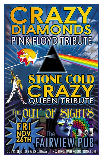 . Friday, November 26th IMU presents CRAZY DIAMONDS Pink Floyd Tribute w/ STONE COLD CRAZY Queen Tribute & The OUT OF SIGHTS @ The Fairview Pub, 898 West Broadway . Doors 9pm / Cover $10 . Purchase advance tickets online @ http://www.imuproductions.com/tix