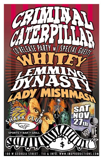 . Saturday, November 27th IMU presents CRIMINAL CATERPILLER CD Release Party w/ WHITEY, LEMMING DYNASTY & LADY MISHMASH @ The Shark Club, 180 West Georgia Street . Doors 9pm / $10 advance tickets available directly via the bands & online @ http://www.imuproductions.com/tix . $12 cover @ the door