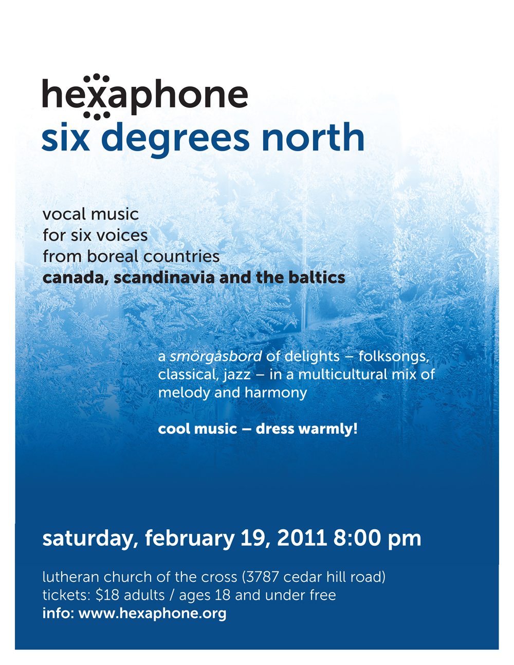 Hexaphone performs “Six Degrees North”  @ Lutheran Church of the Cross Feb 19 2011 - Feb 25th @ Lutheran Church of the Cross