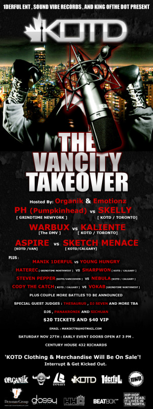 (KOTD) Vancity Takeover: PH vs Skelly, War Bux vs Kaliente, Sketch Menace vs Aspire, Manik 1derful vs Young Hungry, Haterec vs Spook One, Steveip vs Nebula, Cody the Catch vs Vokab @ Century House - 2nd Floor Nov 27 2010 - Feb 3rd @ Century House - 2nd Floor