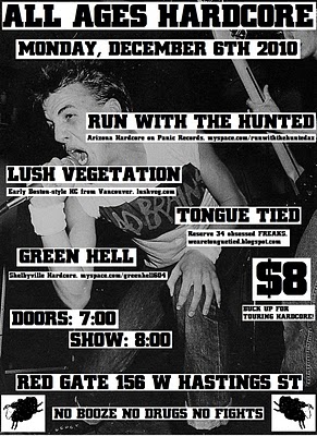 ALL AGES HARDCORE: Run with the Hunted, Lush Veg, Tongue Tied, Green Hell @ The Red Gate Dec 6 2010 - Jan 15th @ The Red Gate