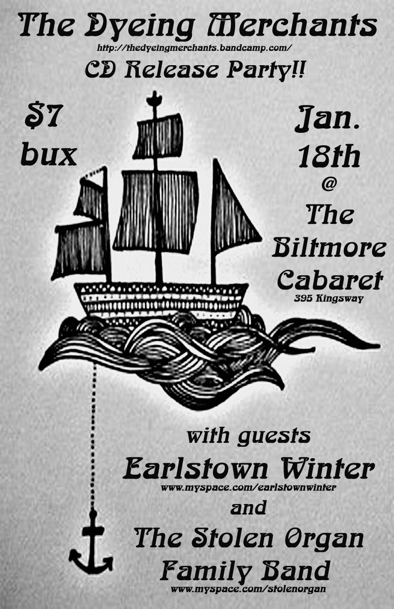 The Dyeing Merchants Vancouver CD Release Party!!: The Dyeing Merchants, Earlstown Winter, Stolen Organ Family Band @ The Biltmore Cabaret Jan 18 2011 - Feb 8th @ The Biltmore Cabaret