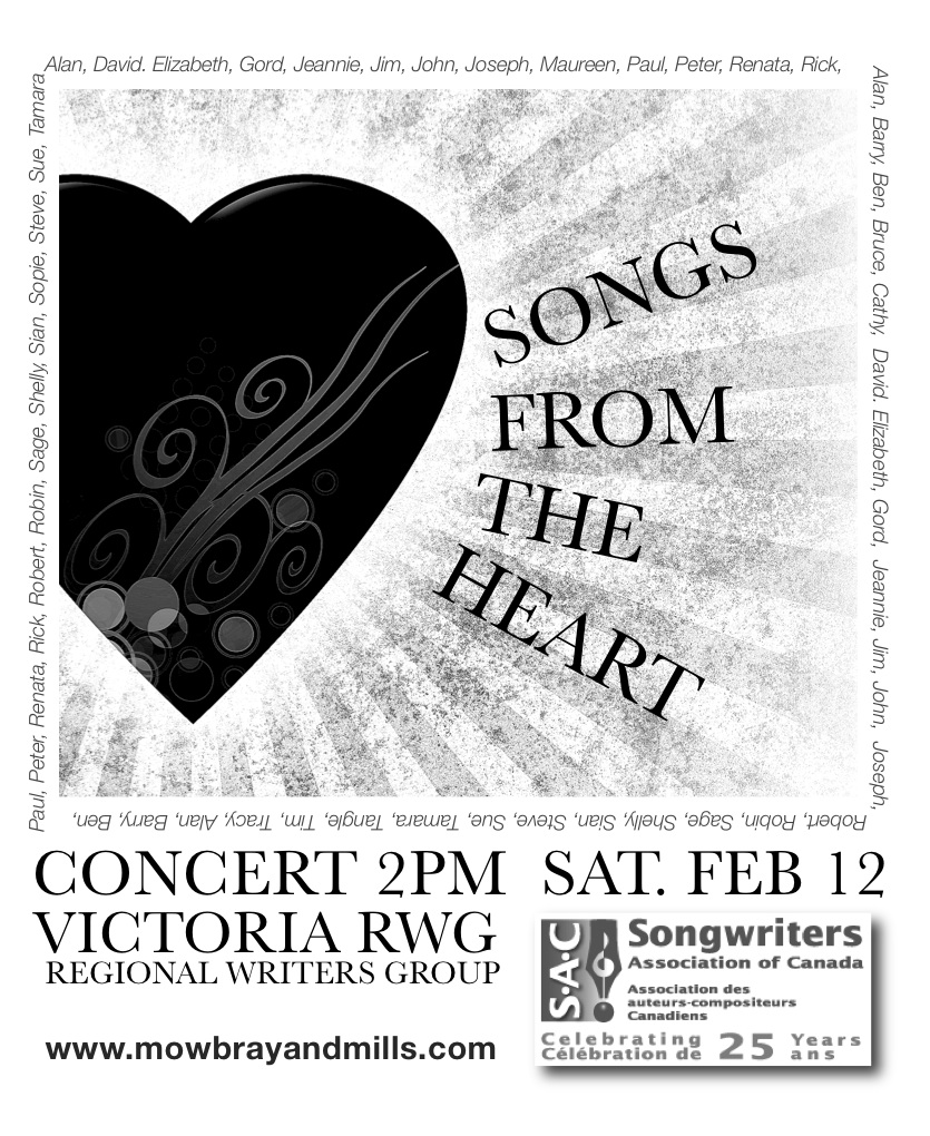 Songwriters from Victoria's Regional Writer's Group perform original songs in this fun and informal concert. Hear a variety of styles and musical genres during the afternoon. CDs, door prizes, & coffee too - a family event!
