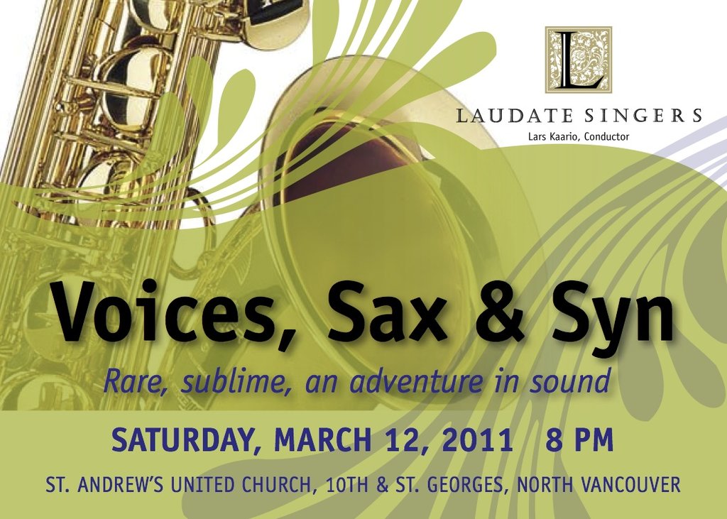 The versatile Laudate Singers joins forces with renowned jazz saxophonists Campbell Ryga and Ross Taggart and talented synthesizer player Tim Tsang in this extraordinary concert that will exhilarate both the traditionalist and the adventurous music-lover.
