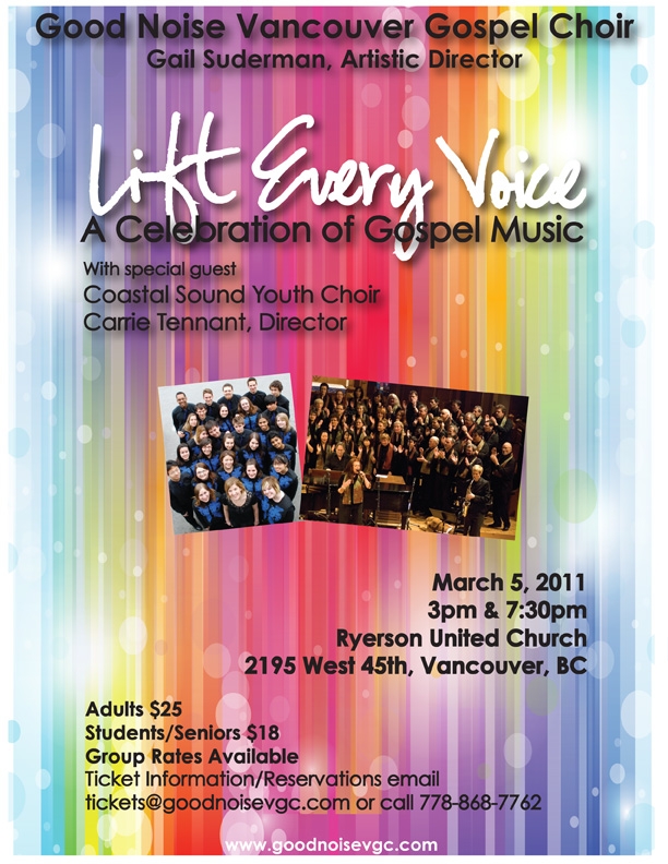 Good Noise Vancouver Gospel Choir invites you to kick-start the Spring season with the concert Lift Every Voice: A Celebration of Gospel Music. Having just recorded their first CD, Good Noise carries their excitement from the studio to the stage, bringing a concert to celebrate the voice and gospel music. In Lift Every Voice, two choirs come together to raise their voices in an explosion of jubilant and dynamic gospel music. The energetic and eclectic Coastal Sound Youth Choir joins Good Noise as special guest, directed by one of Vancouver’s top choir conductors, Carrie Tennant. Experience the intensity of over 120 celebrating choristers to bring rejuvenation to the spirit and soul.