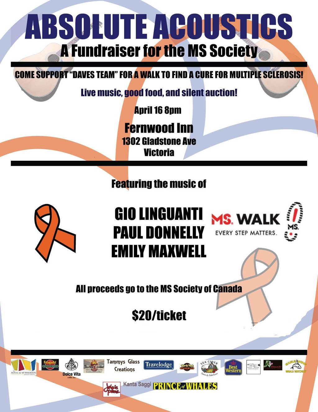 Come enjoy live music, good food, and silent auction at Absolute Acoustics, a fundraiser for the MS Society. Featuring the music of Gio Linguanti, Emily Maxwell, & Paul Donnelly. Silent auction items include deluxe hotel suite gift certificates, whale watching adventures, salon gift certificates, restaurant gift cards, glass and 3D art, bicycle tune-ups & theatre tickets! Email us for tickets. All proceeds go to the Multiple Sclerosis Society of Canada.