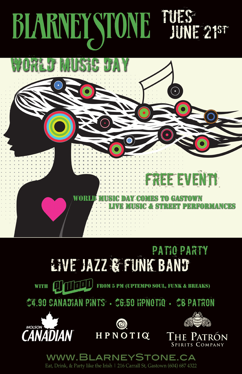 150 Bands take to the streets and venues of Gastown for a night of music mayhem! Join us at the Blarney Stone from 5pm for Soul, Breaks and Funk with DJ "Wood" and live music with a special guest Jazz/Funk band 'til 2am. Canadian, Hypnotiq, and Patron are the specials of the day from ONLY $4.90