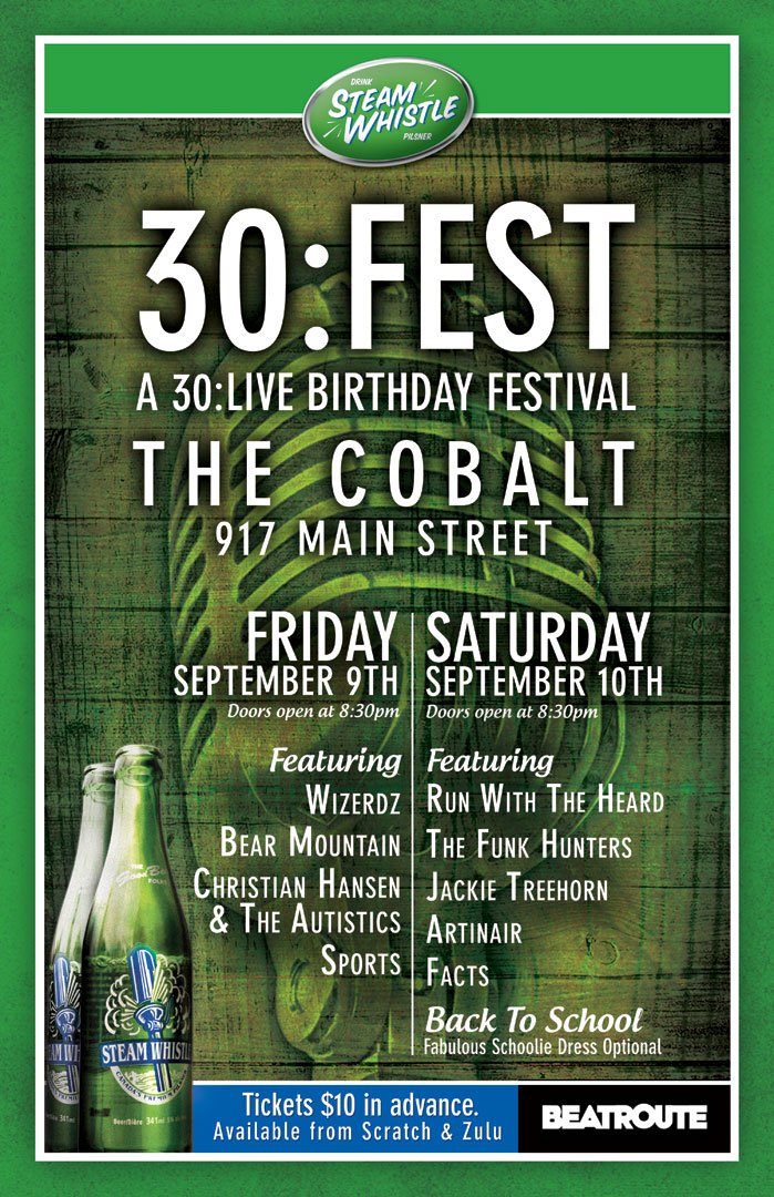 30:FEST - 30:LIVE BIRTHDAY FESTIVAL: The Funk Hunters, Bear Mountain, Christian Hansen and the Autistics, SPORTS @ The Cobalt Sep 9 2011 - Dec 25th @ The Cobalt