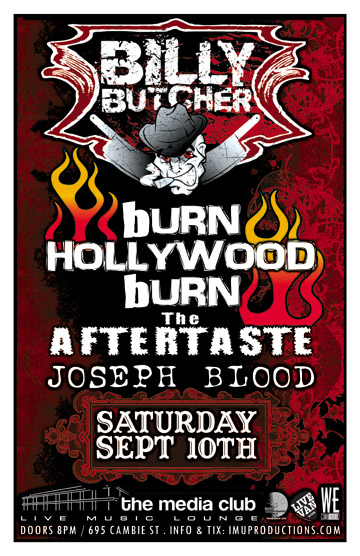 . Saturday, September 10th IMU presents BILLY BUTCHER, bURN HOLLYWOOD bURN, The AFTERTASTE & JOSEPH BLOOD @ The Media Club, 695 Cambie St . Doors 8pm / Cover $10 . Purchase advance tickets online @ http//www.imuproductions.com/tix
