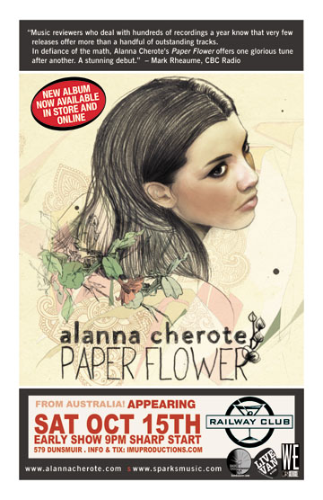 ALANNA CHEROTE - Australian-born Alanna Cherote grew up surrounded by music and musical instruments and developed a passion for the eclectic at an early age. She's toured through England, Holland, Germany, France, Spain and Africa and been nominated for Best Song of the Year at the Music OZ Awards. Her debut full-length "Paper Flower" was released in March via Sparks/EMI Canada and displays the influence of artists like Sheryl Crow, Bon Iver, Ron Sexsmith and Feist. http://www.myspace.com/alannacherote