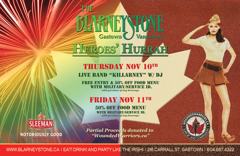 Remembrance Day at the Blarney Stone. Good times are fueled by the sensational sounds of Killarney, straight from Ireland, whose rockin blend of Irish Party music and classic rock n roll reverberates off the bricks and beams of one of Vancouvers most historic rooms- The Blarney Stone. No Cover before 8pm. No cover w/ Military/ Service ID.