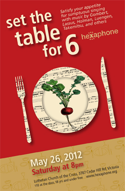 Hexaphone, Victoria’s six-member a cappella ensemble, presents ‘’Set the Table for Six’’, a vocal buffet on the themes of food and friendship. Savour the succulence of French chansons by Gombert and Lassus, a love song to a Mashed Potato, and the lively Epicure of Derek Holman. Complete the feast with Luengen's Mésange, a setting of Coltraine's Naïma, Handmade Proverbs of Takemitsu, a Grain of Sand by Larry Nickel, and more. Let Hexaphone satisfy your appetite for delectable singing!